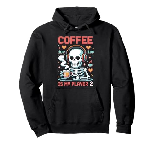 Coffee Is My Player Two Pixel Skeleton Headphones Pullover Hoodie
