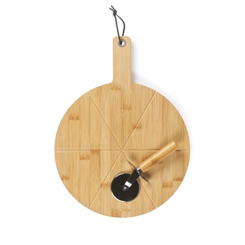 Salter 12” Bamboo Pizza Board & Cutter Set - FSC® Certified, Round Pizza Board with Handle and Stainless Steel Cutter, Integrated Slice Grooves, Reversible Design