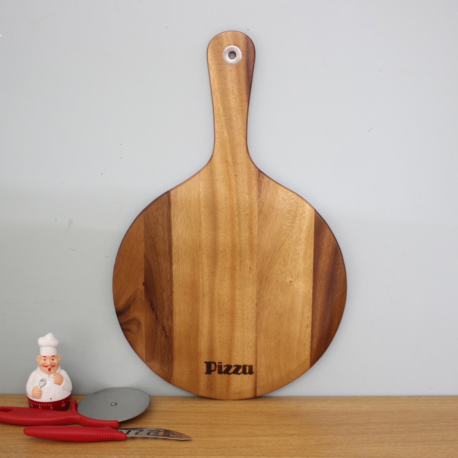Wood Pizza Chopping Board With Cutter & Handle Acacia Reversible Round Paddle