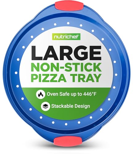 Nutrichef Non-Stick Pizza Tray for Oven, 33cm Round Carbon Steel Baking Trays with Perforated Holes, Silicone Handles, Dishwasher Safe, Pizza Stone Alternative, Blue