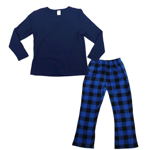 LANBAOSI Girls Fleece Pyjamas Set Lounge Wear Set for Kids Thermal Crew Shirts Long Sleeve Top & Plaid Pyjamas Bottoms Microfleece Nightwear Warm Pjs Sets Navy