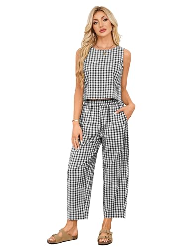 SotRong Women's Summer Gingham Matching Outfit Two Piece Linen Set Sleeveless Crop Top and Barrel Leg Pants Leisure Suits Plaid Pyjamas Casual Lightweight Checkered Co-ord Set Black S