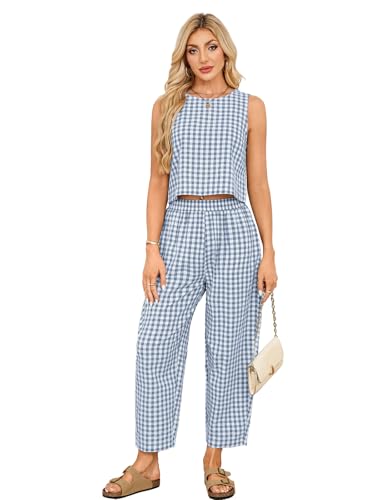SotRong Women's Summer Gingham Matching Outfit Two Piece Linen Set Sleeveless Crop Top and Barrel Leg Pants Leisure Suits Plaid Pyjamas Casual Lightweight Checkered Co-ord Set Sky Blue L