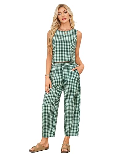 SotRong Women's Summer Gingham Matching Outfit Two Piece Linen Set Sleeveless Crop Top and Barrel Leg Pants Leisure Suits Plaid Pyjamas Casual Lightweight Checkered Co-ord Set Bean Green S