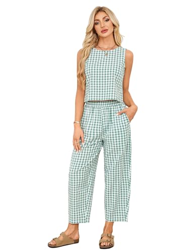SotRong Women's Summer Gingham Matching Outfit Two Piece Linen Set Sleeveless Crop Top and Barrel Leg Pants Leisure Suits Plaid Pyjamas Casual Lightweight Checkered Co-ord Set Bean Green L