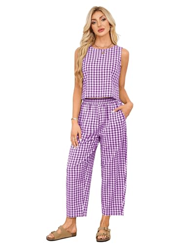 SotRong Women's Summer Gingham Matching Outfit Two Piece Linen Set Sleeveless Crop Top and Barrel Leg Pants Leisure Suits Plaid Pyjamas Casual Lightweight Checkered Co-ord Set Purple S