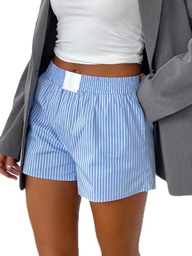 YILEEGOO Women's Elastic Waisted Striped/Plaid Shorts Pyjamas Bottoms Loungewear Summer Beach Shorts Wide Leg Boxers Boyshorts (Blue, S)