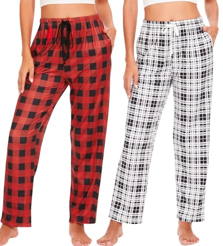 Ymmchy Women's Pajama Bottoms Lounge Pants Printed Plaid Pyjamas Checkered Pants Sleep Trousers with Pockets 2-Pack Red Plaid/Black Pl M