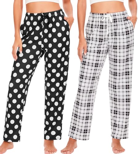 Ymmchy Women's Pajama Bottoms Lounge Pants Printed Plaid Pyjamas Checkered Pants Sleep Trousers with Pockets 2-Pack Dots/Black Plaid M