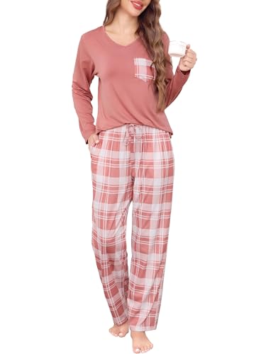 Sopesil Women's Pyjamas Plaid Sets Ladies PJs Long Sleeve Soft 2 Pieces Sleepwear Cosy Loungewear Nightwear with Pockets, Flesh pink, L