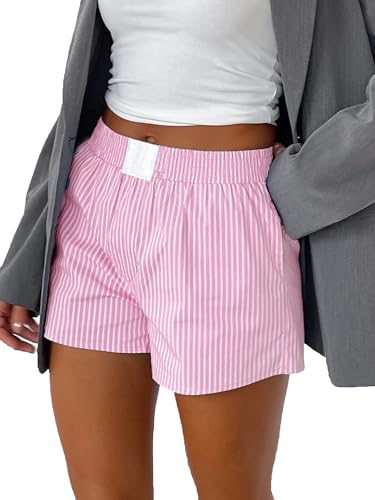 YILEEGOO Women's Elastic Waisted Striped/Plaid Shorts Pyjamas Bottoms Loungewear Summer Beach Shorts Wide Leg Boxers Boyshorts Pink
