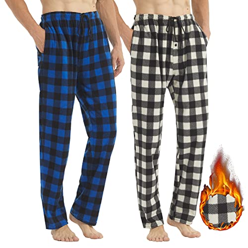 LANBAOSI Mens Pjs Bottoms Fleece 2 Pack Checked Fluffy Lounge Pants Plaid Pyjamas Long Thermal Sleep Nightwear Trousers with Pockets