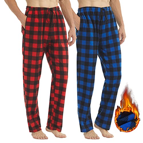 LANBAOSI Mens Pjs Bottoms Fleece 2 Pack Checked Fluffy Lounge Pants Plaid Pyjamas Long Thermal Sleep Nightwear Trousers with Pockets Red/Blue