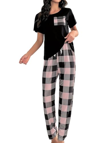 Cormfywear Pyjama Set for Women Nightwear PJ Set Lounge Wear Pajama Set Stylish Plaid Pyjamas Set for Women #A Pink Large