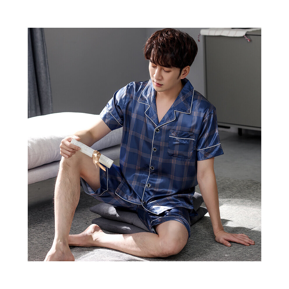 Summer Silk Men Pajamas Set Plaid Pyjamas Short Sleeve Turn-down Collar Mens Sleepwear Loose Lounge M-4XL Male Pijamas