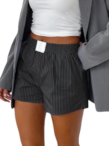 YILEEGOO Women's Elastic Waisted Striped/Plaid Shorts Pyjamas Bottoms Loungewear Summer Beach Shorts Wide Leg Boxers Boyshorts (Striped Black, M)
