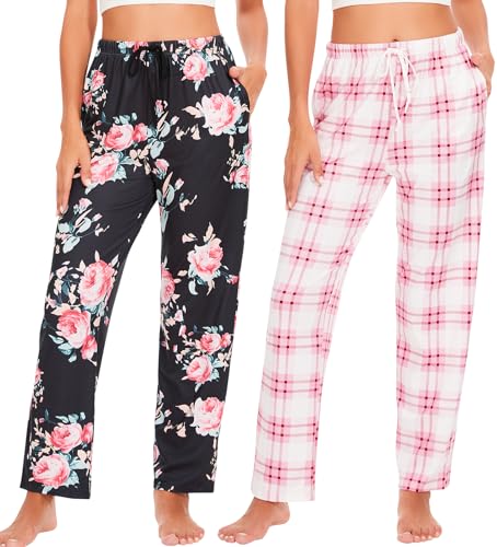 Ymmchy Women's Pajama Bottoms Lounge Pants Printed Plaid Pyjamas Checkered Pants Sleep Trousers with Pockets 2-Pack Black Flowers/Pink Plaid S