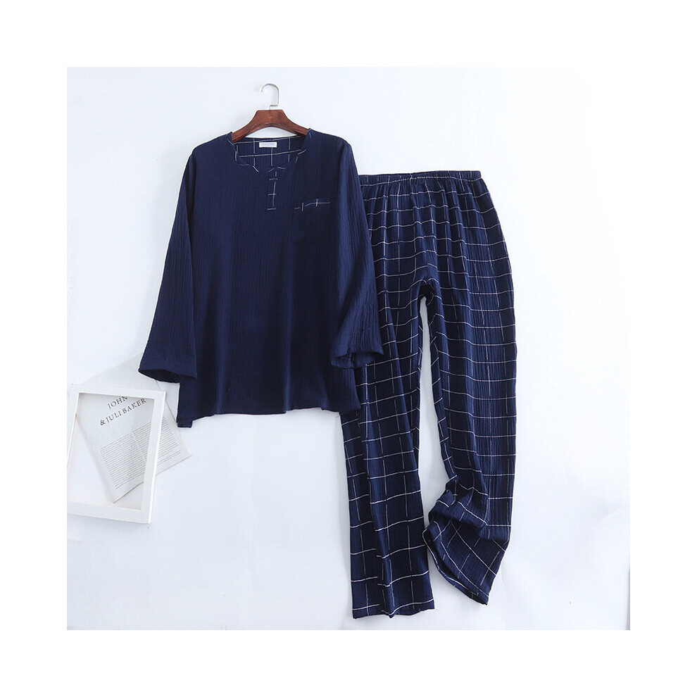 Spring Men Pajamas O-Neck Long Sleeve Sleepwear Double Layer Washed Gauze Pyjamas Plaid Pants Nightwear Plus Size Home Suit