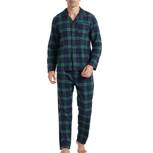 LANBAOSI Men's Pajama Sets Long Sleeve Checked Lounge Wear Set Flannel Pyjamas Plaid Top and Bottoms 2 Piece Winter Cotton Nightwear Green