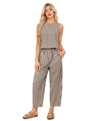 SotRong Women's Summer Gingham Matching Outfit Two Piece Linen Set Sleeveless Crop Top and Barrel Leg Pants Leisure Suits Plaid Pyjamas Casual Lightweight Checkered Co-ord Set Brown S