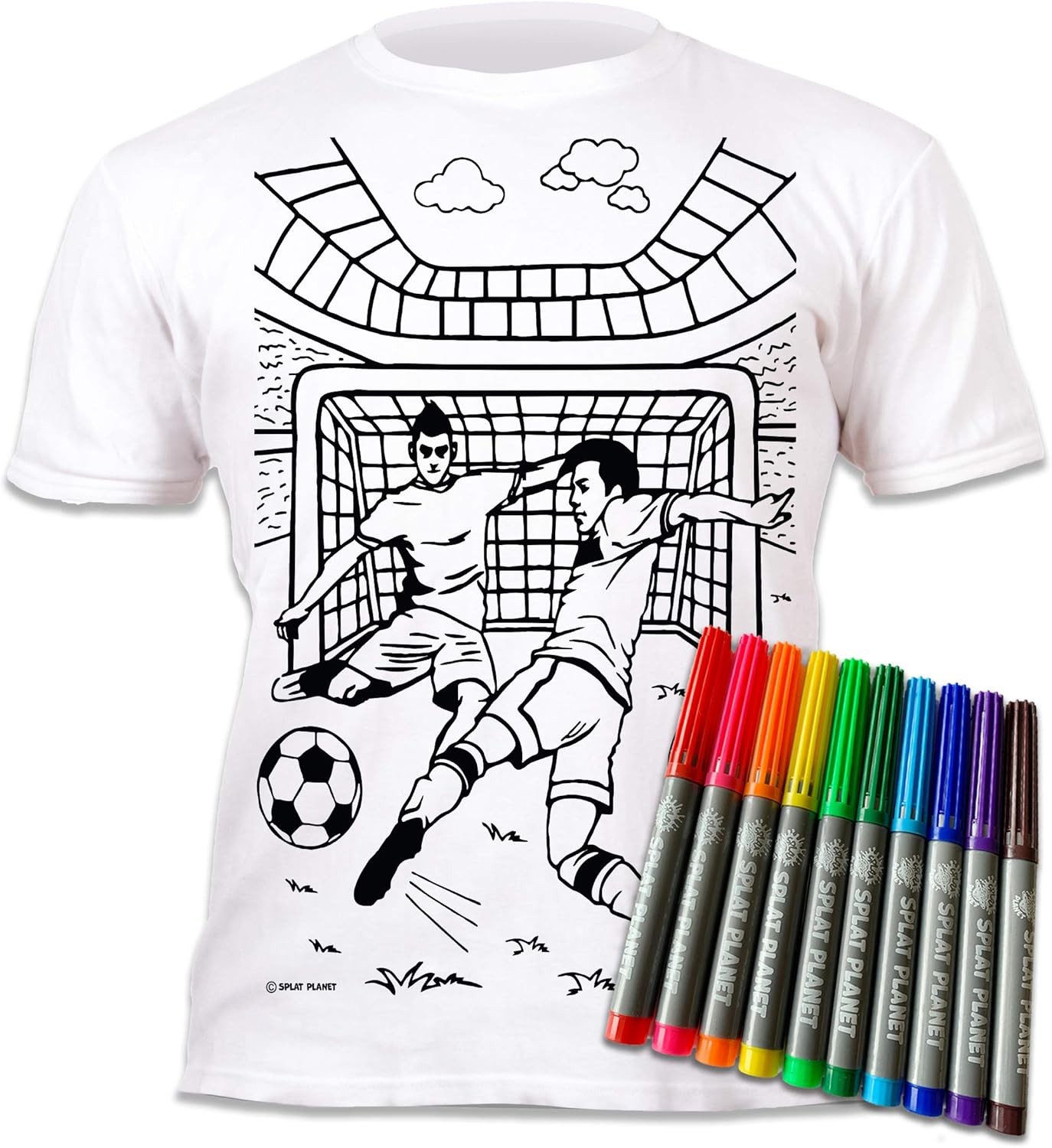 Splat Planet Colour-in Football T-Shirt with 10 Non-Toxic Washable Magic Colouring Pens - Colour-in and Wash Out T-Shirt (9-11 Years) White