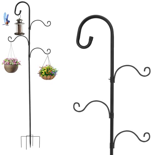 FEED GARDEN [Upgrade Version Adjustable Shepherds Hook Bird Feeder Pole with 7 Prongs Base, 76 Inch Tall Heavy Duty Outdoor Garden Poles for Hanging Bird Feeders, Plant Baskets, Black (1 Pack)