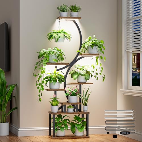 Wufuuoa Plant Stand Indoor with Grow Lights & Wheels, 8-Tiered Tall Plant Stand,Lighted Corner Plants Self for Indoor Growing Large Flower Holder, Tree-Shaped Plants Rack for Home, Patio Brown