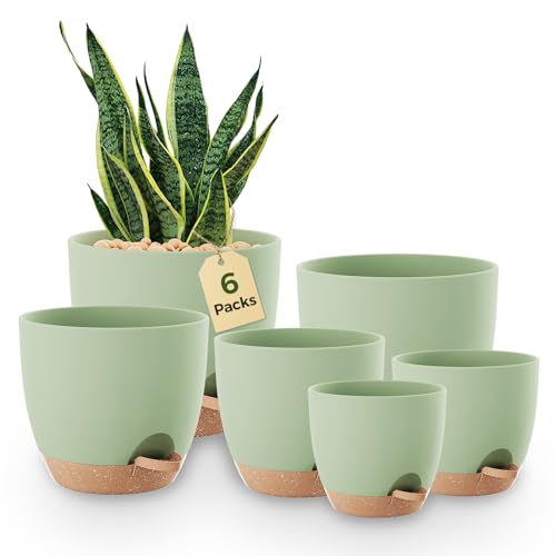 Bamworld Self Watering Plant Pots Indoor Set of 6, Plastic Flower Pots 12.7/14/15.2/16.5/17.8/20.3 cm with Saucers and Drainage Holes for Outdoor Windowsill Garden Decor(Green)