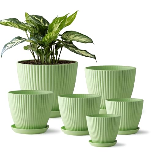 RooTrimmer 7.5/6.5/5.5/4.9/4.2/3.5 inches Flower Pots 6 Pack, Thick Sturdy Plastic Planters, Indoor/Outdoor 6 Sizes Plant Pots with Drainage Holes and Saucers (6 Sizes, Green)