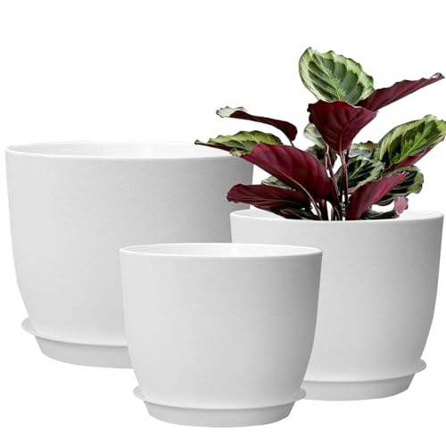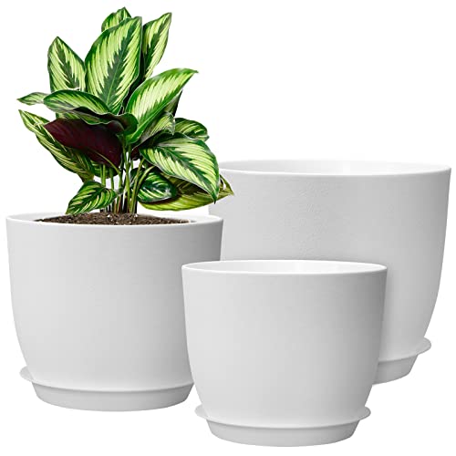 10/9/8 inch Plant Pots, Set of 3 Modern Decorative Plastic Planters with Drainage Holes and Saucers for House Plants Indoor Flowers Plants, White