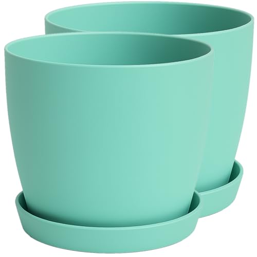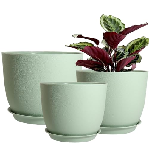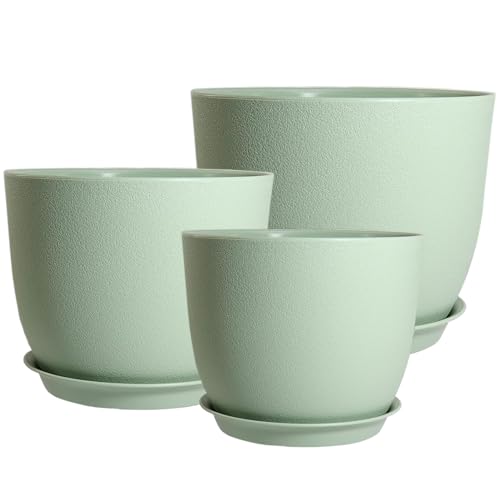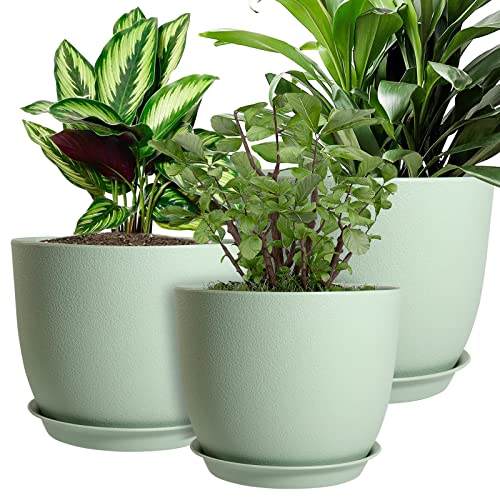 WOUSIWER Plant Pots 10/9/8 inch, Set of 3 Modern Decorative Plastic Planters with Drainage Holes and Saucers for House Plants Indoor Flowers Plants, Green