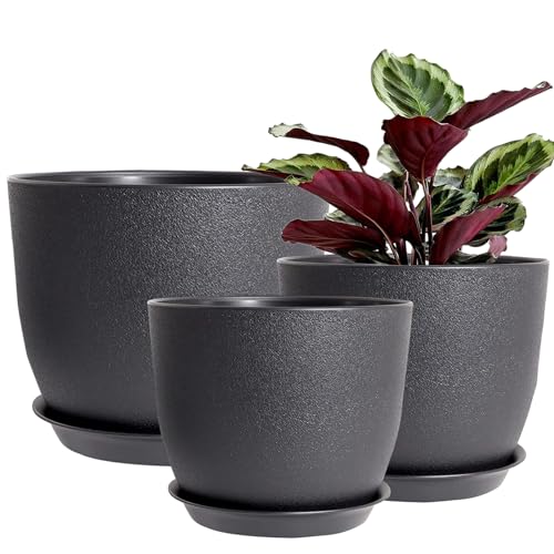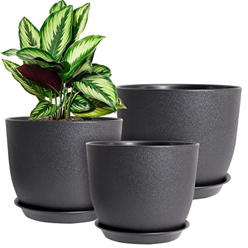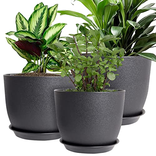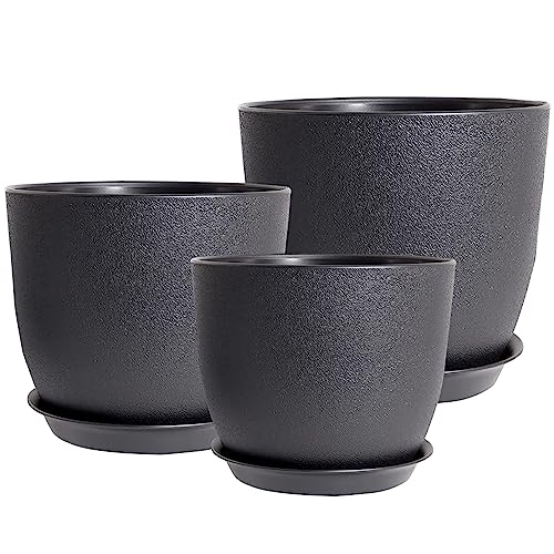 WOUSIWER Plant Pots 10/9/8 inch, Set of 3 Modern Decorative Plastic Planters with Drainage Holes and Saucers for House Plants Indoor Flowers Plants, Black