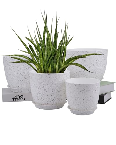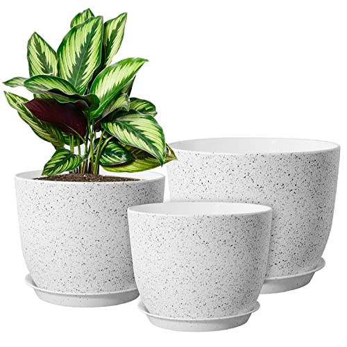 WOUSIWER Plant Pots 10/9/8 inch, Set of 3 Modern Decorative Plastic Planters with Drainage Holes and Saucers for House Plants Indoor Flowers Plants, White Speckles