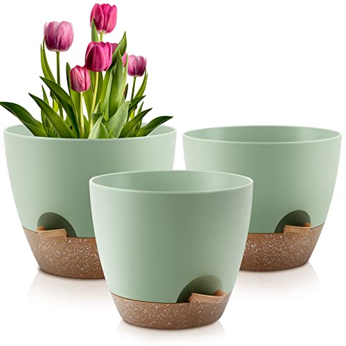 QRRICA Plant Pots 10/9/8 Inch Self Watering Pots, Set of 3 Plastic Planters with Drainage Holes and Saucers,Plastic Flower Pots,Nursery Planting Pot for Indoor Out Door Plants(Green)