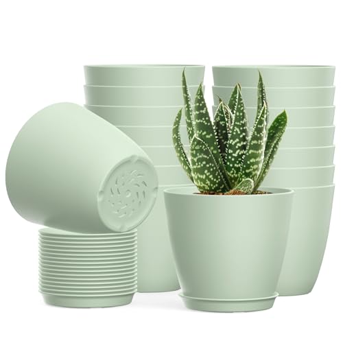 UOUZ 16Pack 4inch Small Plant Pots, Plastic Planters with Drainage Holes and Saucers for Indoor Outdoor Garden Plants and Flowers, Green