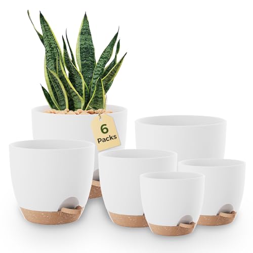 Bamworld Self Watering Plant Pots Indoor Set of 6, Plastic Flower Pots 12.7/14/15.2/16.5/17.8/20.3 cm with Saucers and Drainage Holes for Outdoor Windowsill Garden Decor(White)