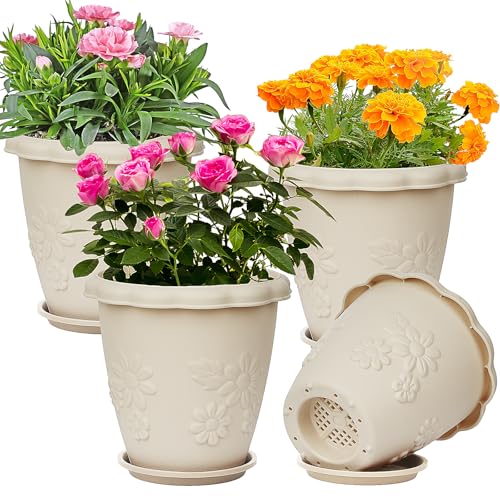 IWTTWY 4 Pack Plastic Plant Pots, 18CM Modern Flower Pots with Saucers and drainage holes, Thicken Orchid Pots Planters Indoor Outdoor for Herb, Peace Lily, Snake Plant, Succulent (Off White)