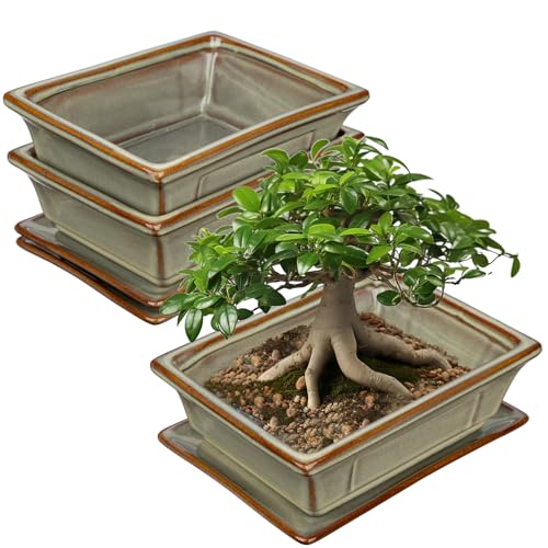 Oairse Set of 2 Bonsai Pots Shallow Succulent Planters for Live Bonsai Trees, 19cm/7.5" Ceramic Plant Pot for Indoor/Outdoor Succulents, Cactus with Drainage Hole and Saucers, Brown Flower Pot