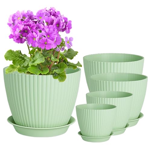 PROFIKLA 18/15/14/13/11.5cm Plastic Plant Pots, Pack of 5 Flower Pots, Plant Pots with Drainage Holes and Saucers, Modern Decorative Planters, Green