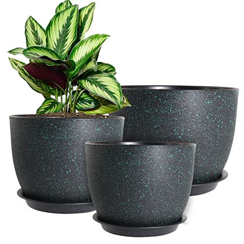 WOUSIWER 10/9/8 inch Plant Pots, Set of 3 Modern Decorative Plastic Planters with Drainage Holes and Saucers for House Plants Indoor Flowers Plants, Black Speckles