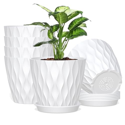 8 Inch Flower Pots 5 Pack, Plastic Plant Pots with Drainage Holes and Saucers, Tray. Large Planters for Indoor Plants, White Pots Set for House, Outdoor Plants, Orchid. Unique Decorative Planting Pots