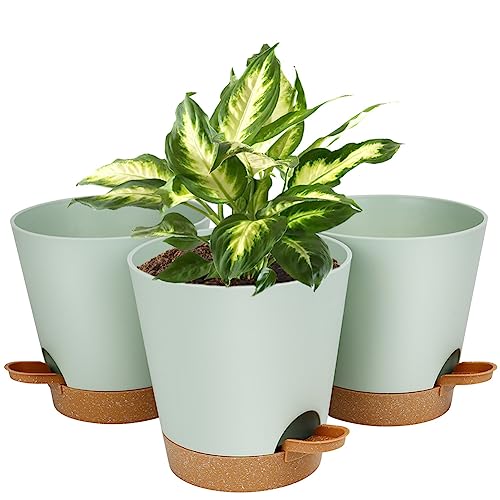 OFFCUP Plant Pots, 3pcs Plastic Plant Pots 16.5cm Self Watering with Drainage Holes, Saucers and Reservoir, Suitable for Plants Indoor Modern Fashion Decorative Plastic (Green)