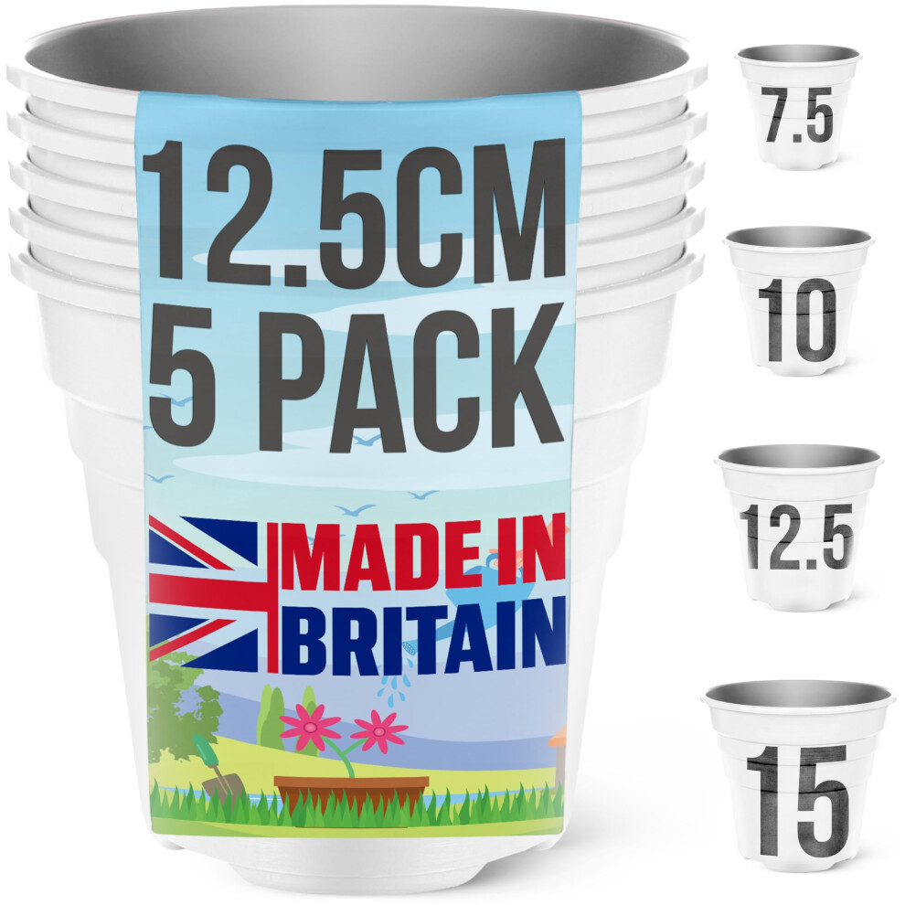 Happy Pots ECO 12.5cm Gloss White - Pack of 5 Premium Plastic Plant Pots - Reusable Flower Pots for Indoor/Outdoor Home Décor Gardening - Round, Heav