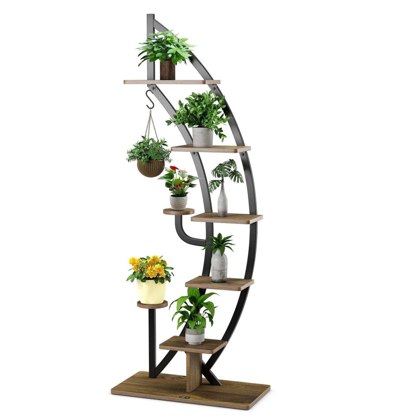 8-Tier Tall Wooden Plant Stand Rack Curved Half Moon Shape Ladder Planter Shelf W/ Top Hook