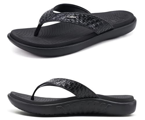 KuaiLu Womens Flip Flops Ladies Yoga Mat Comfortable Walking Thong Sandals with Plantar Fasciitis Arch Support Slip On Indoor Outdoor for Summer, Black Size 7