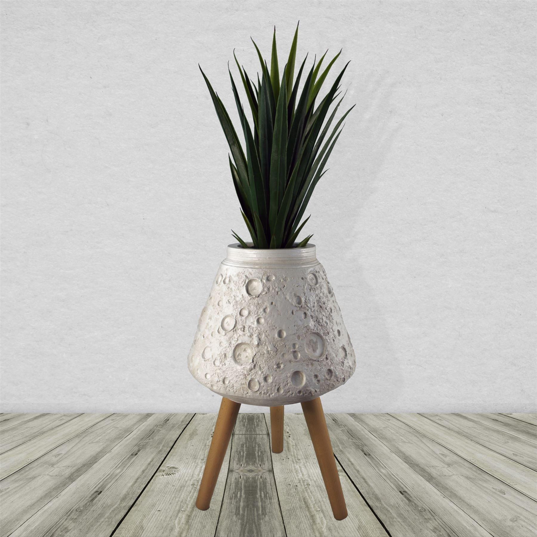 Anzio Stone White Planter with Wooden Stand, H38.5cm x D24cm