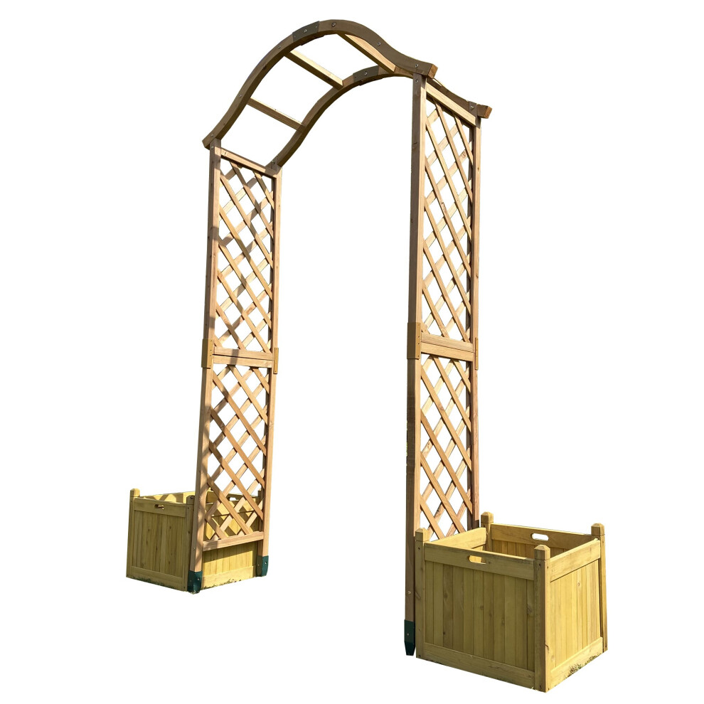 Dorchester Wooden Arch with Planters & Ground Spikes - Tan Preservative, Sturdy Trellis for Climbing Plants, 2 Planters Included (GFL103)