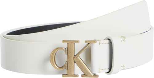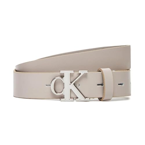 Calvin Klein Women's Monogram Plaque Buckle 3 cm Leather Belt, Off-White (Silver Birch/Tumbled Gold), 31.5 inches