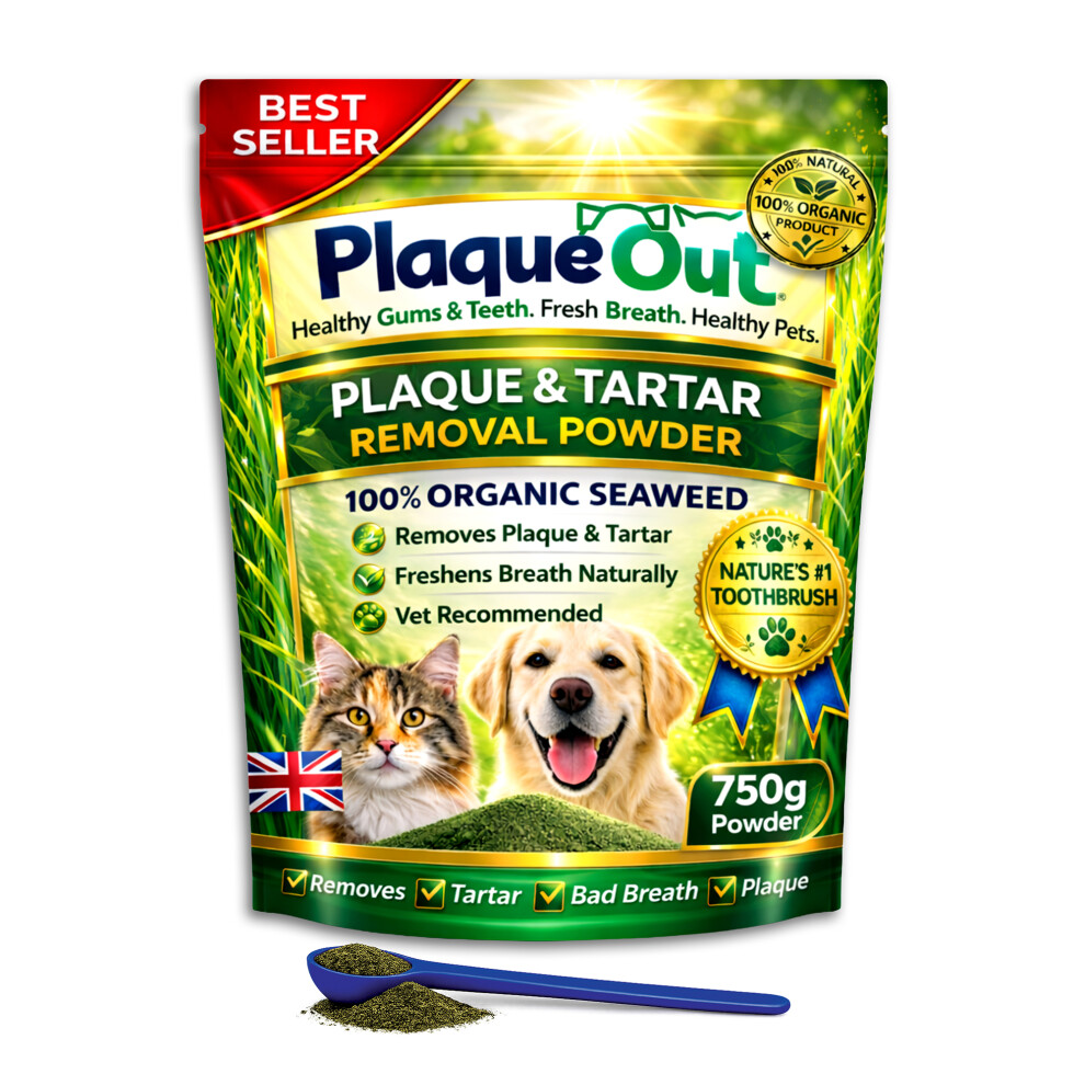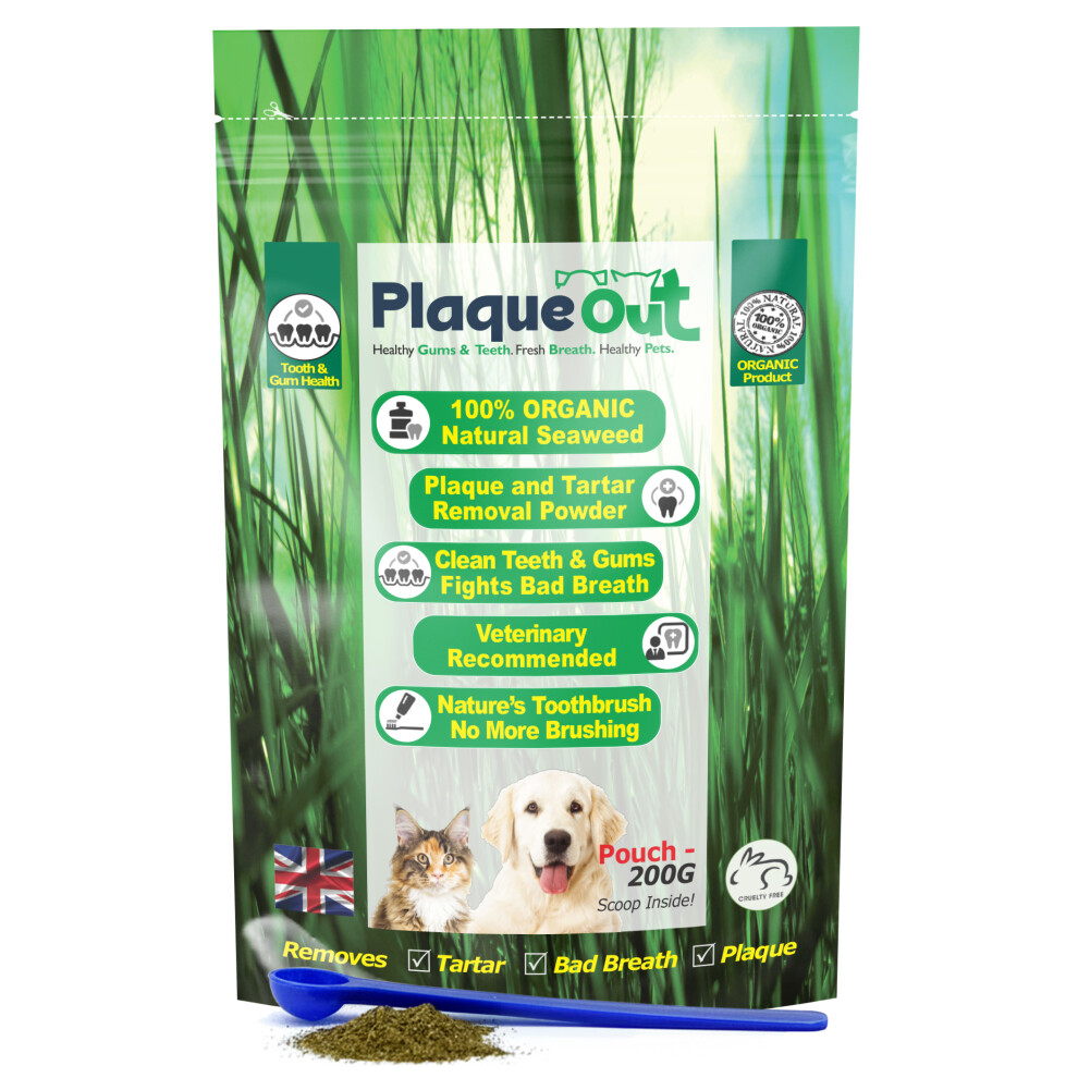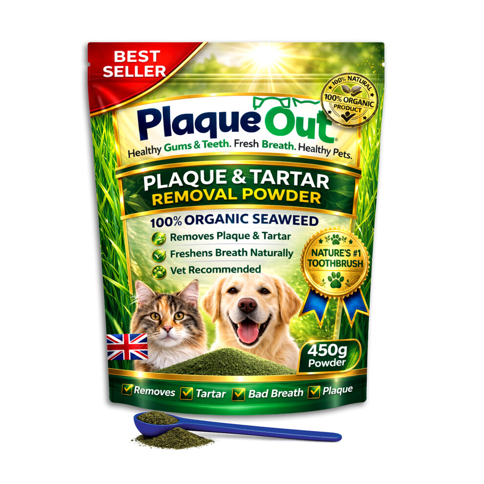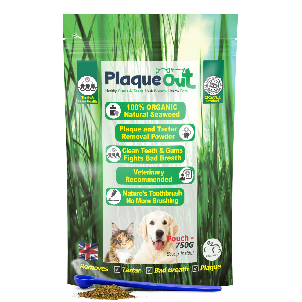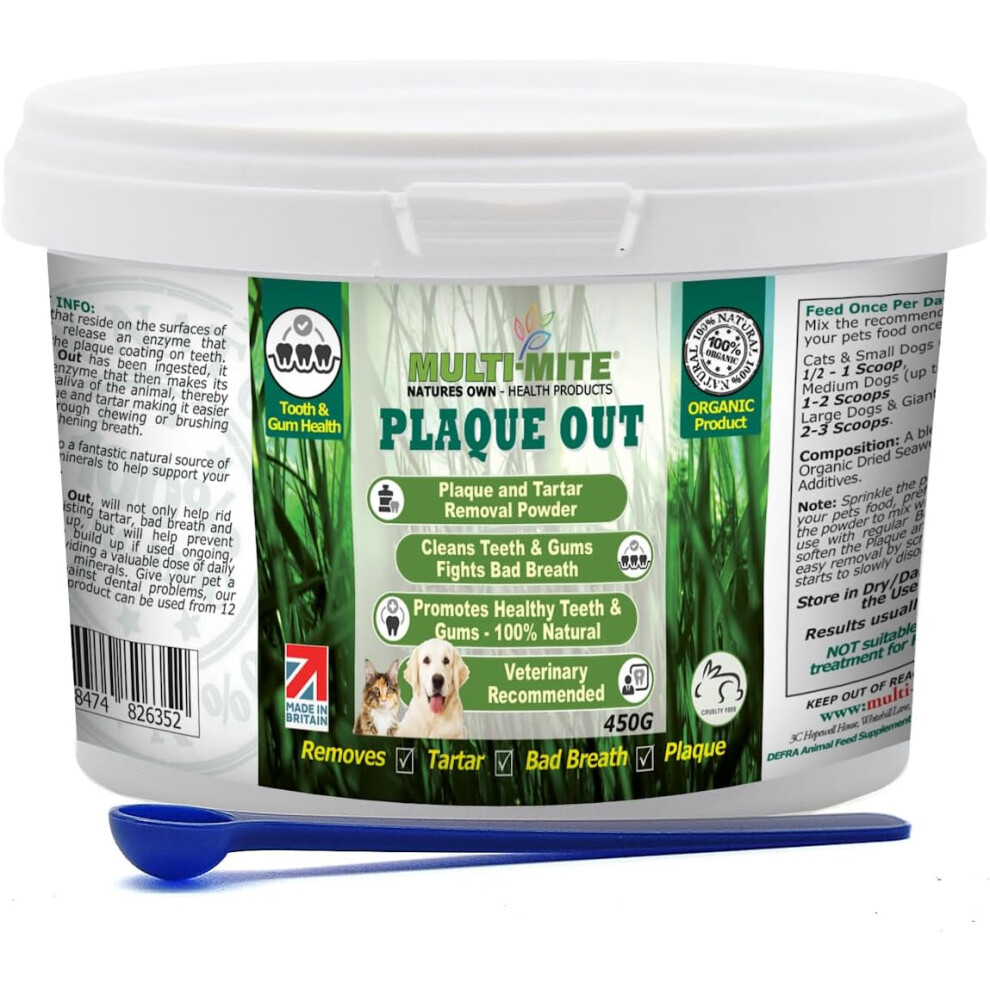 PLAQUE OUT 450g Pot - Plaque Off Remover - 100% Natural and Organic Seaweed Powder for Dogs & Cats - Dog Teeth Cleaning, Plaque Removal, Pet Dental Care, Bad Breath, Gum Care and Tartar Control