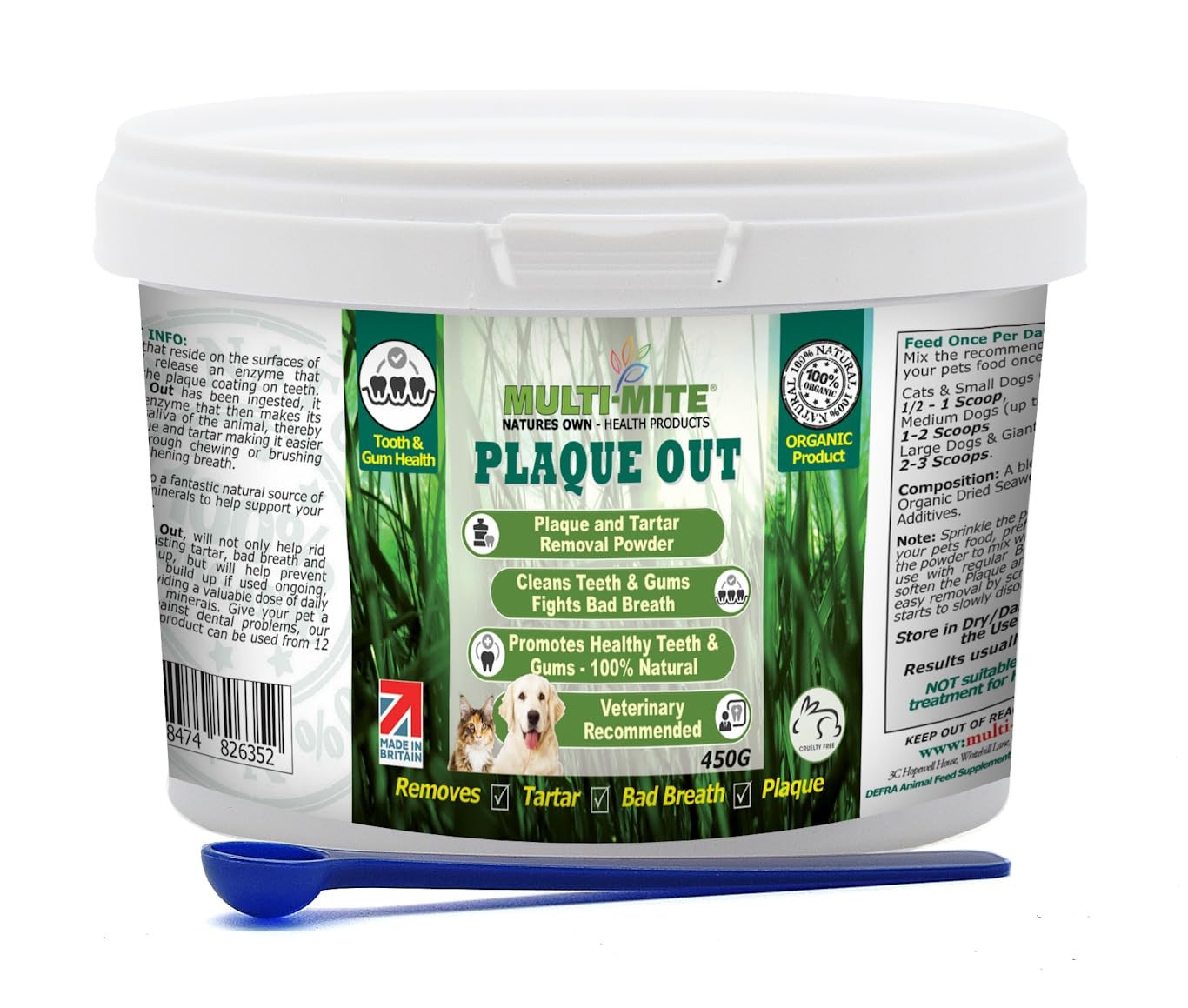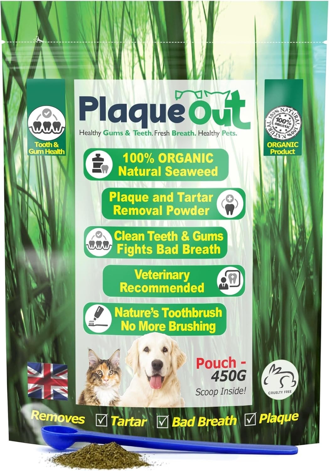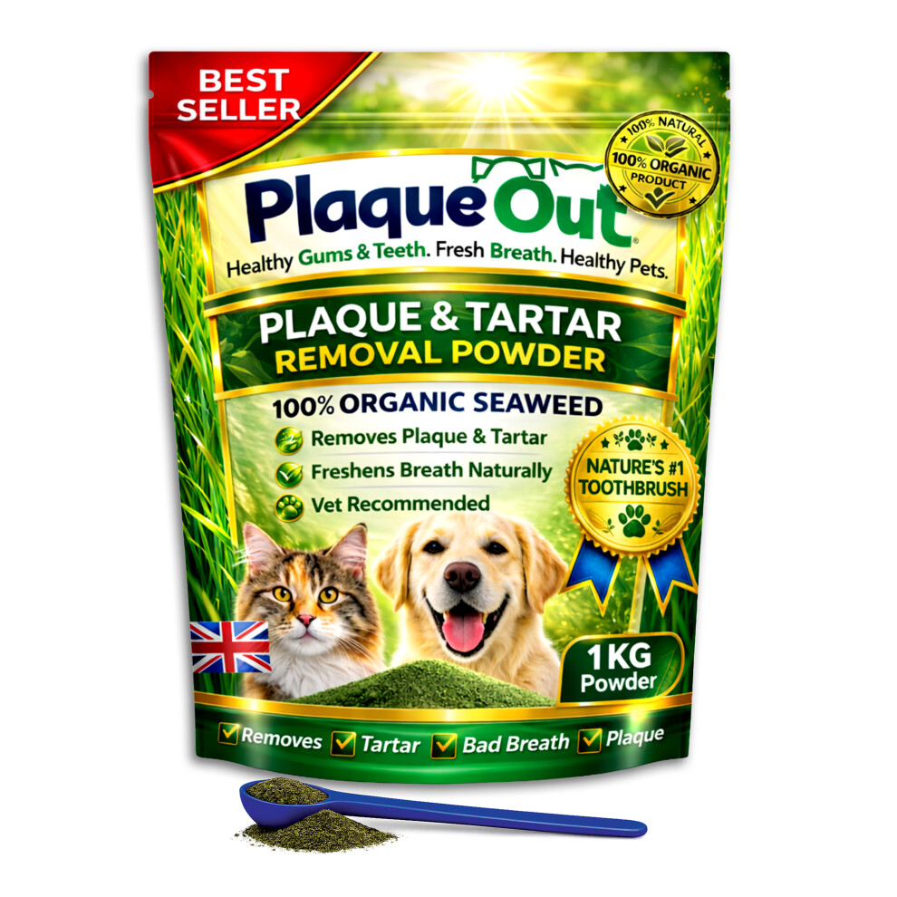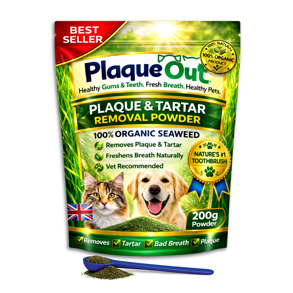 PLAQUE OUT 450g Pot - Plaque Off Remover - 100% Natural and Organic Seaweed Powder for Dogs & Cats - Dog Teeth Cleaning, Plaque Removal, Pet Dental Care, Bad Breath, Gum Care and Tartar Control